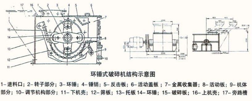 PCH系列環(huán)錘式破碎機是一種帶有環(huán)錘的沖擊轉(zhuǎn)子式破碎機,物料進入破碎機后,首先受到隨轉(zhuǎn)子高速旋轉(zhuǎn)的環(huán)錘的沖擊作用而破碎,被破碎的物料同時從環(huán)錘處獲得動能,高速度地沖向破碎板。然后落到篩板上,受到環(huán)錘的剪切、擠壓、研磨以及物料與物料之間的相互作用進一步破碎,并透過篩孔排出。不能破碎的雜物則進入金屬收集器,定期清除。