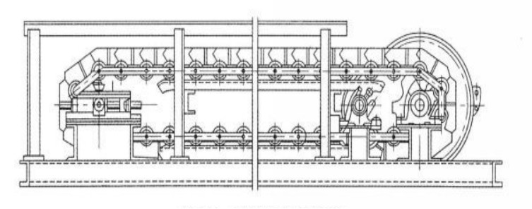 采用節(jié)距為228.6mm(9吋)的高強(qiáng)度推土機(jī)模鍛鏈條為牽引件,兩根鏈條繞過(guò)安裝在機(jī)體頭部的一對(duì)驅(qū)動(dòng)鏈輪和機(jī)體尾部的一對(duì)張緊輪聯(lián)成封閉形回路,在兩排鏈條的每個(gè)鏈節(jié)上裝配了相互交迭的、重型結(jié)構(gòu)的輸送槽而成為一個(gè)連續(xù)的能夠運(yùn)載物料的輸送線路。其自重和物料的重量由安裝在機(jī)體上的多排支重輪、鏈托輪和滑道梁支承。傳動(dòng)系統(tǒng)經(jīng)交流變頻調(diào)速電動(dòng)機(jī)聯(lián)接減速機(jī),再由漲套與驅(qū)動(dòng)裝置直聯(lián)驅(qū)動(dòng)運(yùn)載機(jī)構(gòu)低速運(yùn)行。將尾部料倉(cāng)卸入的物料沿輸送線路運(yùn)至機(jī)體的前方排出,實(shí)現(xiàn)向下方的工作機(jī)械連續(xù)均勻喂料的目的。