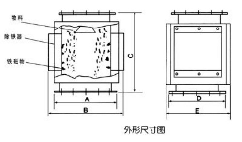 物料經(jīng)過本除鐵器時(shí),經(jīng)除鐵器中心分流板把物料分流到管道除鐵器的磁場覆蓋區(qū),鐵磁性物質(zhì)被吸附在管道壁上,清除鐵磁性物時(shí)打開側(cè)門,把鐵磁性物質(zhì)取出即可。