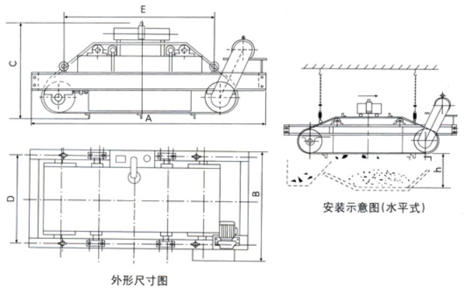 | 型號 | 項目 → | 適應(yīng)帶寬 | 額定吊高 | 物料厚度 | 勵磁功率 | 驅(qū)動功率 | 外形尺寸mm | ||||