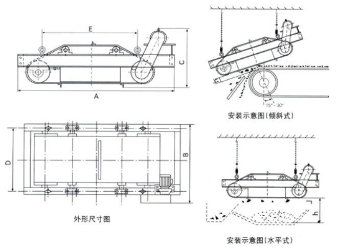| 參數(shù) 型號(hào) | 項(xiàng)目 | 適應(yīng)帶寬mm | 額定吊高h(yuǎn) mm | 磁場(chǎng)強(qiáng)度mT | 物料厚度≤mm | 勵(lì)磁功率≤kw | 驅(qū)動(dòng)功率≤kw | 適應(yīng)帶速≤m/s | 重量kg | 外形尺寸mm | ||||
